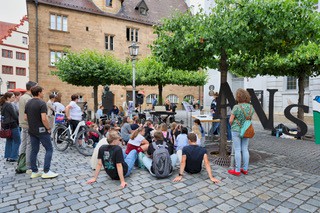 Im Beringershof standen mit Musik des Impressionismus die Klangfarben im Mittelunkt und kamen durch luftig-leichte Kreidemalerei der Zuhörenden zum Ausdruck. Im barocken Hofgarten wies ein bunter Pfeil als große perspektivische Installation an den Baumstämmen des oberen Lindensaals Richtung Leonhart-Fuchs-Garten, in dem unter ebenso bunten Sonnenschirmen das Vororchester schwungvolle Tanzmusik spielte.