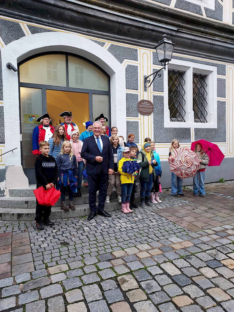 Bei ihrem ersten Wandertag am Carolinum erlebten die Kinder der Klasse 5b eine besondere Überraschung: Ein leicht verregneter Stadtsparziergang führte sie unter anderem zur ehemaligen markgräflichen Hofkanzlei am Montgelasplatz, wo sie gerade kostümierte Mitglieder des Ansbacher Heimatvereins interviewten, als plötzlich der bayerische Innenminister Joachim Herrmann höchstpersönlich das Gebäude verließ. Innenminister Herrmann hatte gerade eine kleine Verschnaufpause während seines Stadtbesuchs anlässlich des 30-jährigen Bestehen der Außensenate des Bayerischen Verwaltungsgerichtshofs und der Landesanwaltschaft Bayern, sodass er gerne der Bitte couragierter Schülerinnen nachkam, gemeinsam mit der Klasse eine Foto zu schießen. Es schloss sich ein nettes kleines Gespräch mit dem Politiker an, der selbst das humanistische Gymnasium Fridericianum in Erlangen besucht hatte und für die Kinder antike Weisheiten auf Latein und Altgriechisch zitierte. Man kam zu dem gemeinsamen Schluss, dass die besten Schulen Bayerns auf -um enden.